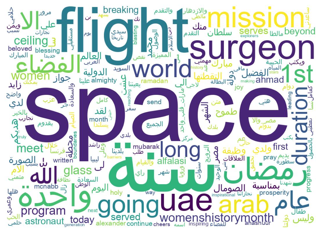 The tweets discuss the achievements of Emirati women in the UAE's space program, specifically highlighting Flight Surgeon Hanan AlSuwaidi and astronauts Hazzaa Al Mansoori and Sultan AlNeyadi. They also include well wishes for the holy month of Ramadan and questions for the astronauts about their experiences in space. Additionally, there is a request for a job opportunity at the Mohammed Bin Rashid Space Centre from a Somalian individual who shares their experiences of living in different countries in Europe.