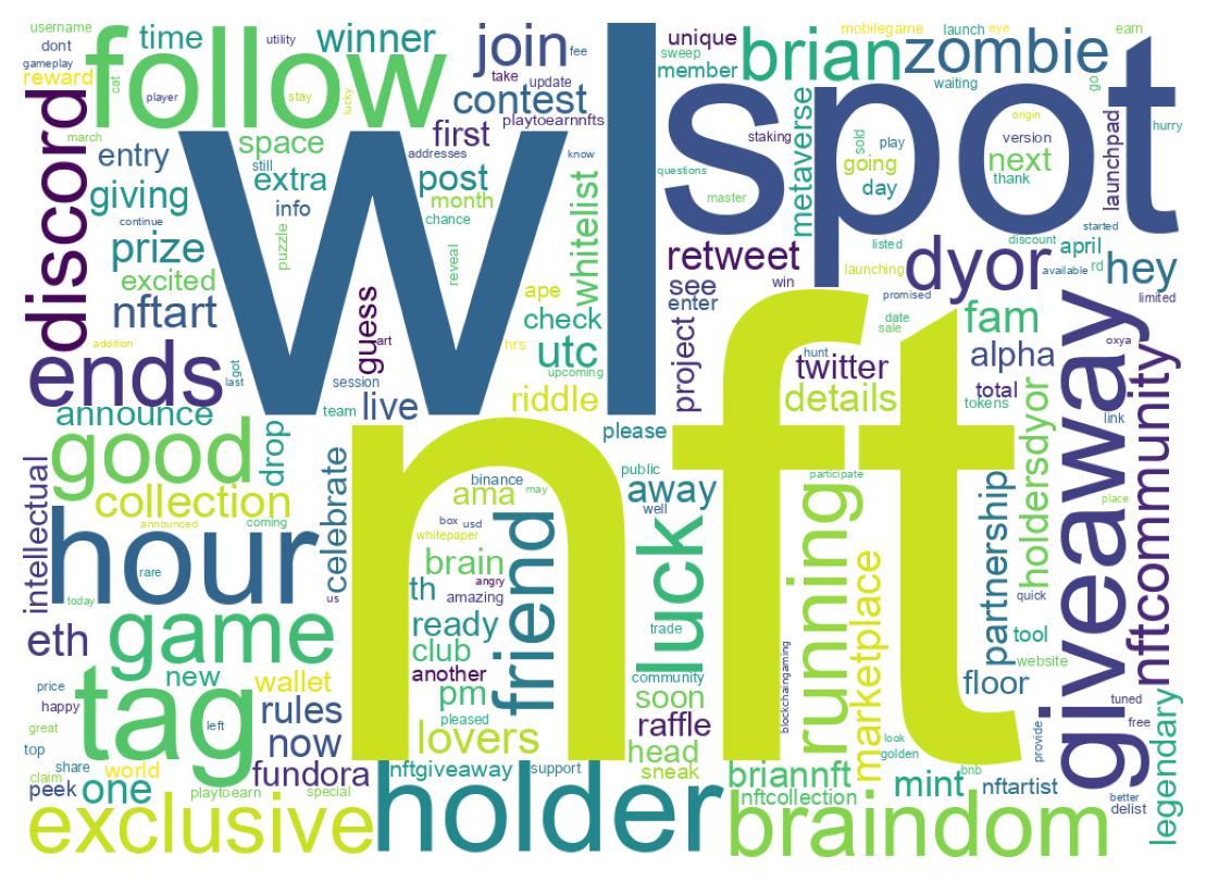 | 1476117152088346624 | Retweet and Tag-5 NFT lovers for 10 WL spots 🔥 Braindom Games with 150 + Million Downloads Worldwide With 120 K+ Discord Members Most Hyped #NFT project: Arriving to Metaverse 😎 #NFTCommunity #NFTGiveaway https://t.co/IVlgHxal8v | 774 |