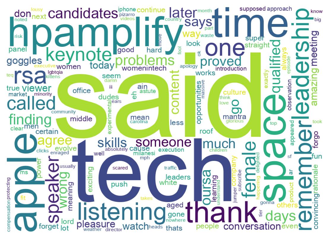 The tweets cover a range of topics including meetings with @caro_milanesi, discussions about diversity in tech events, observations on Apple's foray into augmented reality, lighthearted comments about cats and weather, criticism of clickbait content, and debates about diversity initiatives.