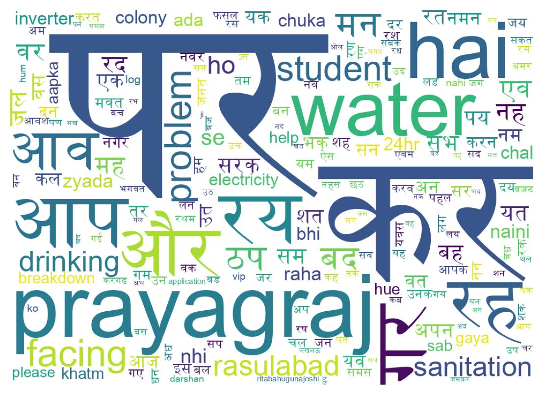 The tweets cover a range of issues in the Prayagraj region of India, including poor healthcare services, demands for better electricity supply and working conditions for electricity workers. Other tweets discuss issues such as farmers suffering from weather-related crop damage and difficulty with transportation due to bus strikes. Some tweets also mention important cultural events and historical references in the region.