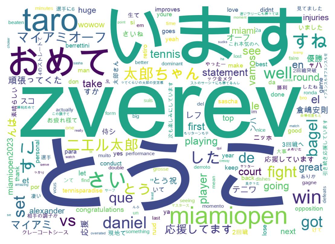 | 1640100637131120642 | 太郎ちゃんRuusuvuoriにストレートで負けた😣😣。セカンドはTBまで行ったし惜しかった。Ruusuvuoriはフィンランド人なのに暑さがこたえないのかしら不思議。でも今大会でのズべレフに対する勝利は結果だけでなく内容が最高だったの絶対忘れない。サクセスフルなマイアミ大会でしたね!👏@tarodaniel93 | 81 |