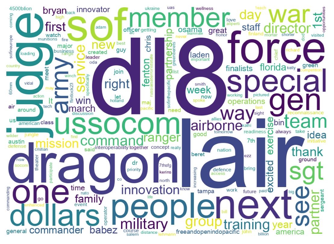 The tweets cover a range of topics related to the United States Special Operations Command (USSOCOM), including training exercises, collaborations with organizations such as DARPA, and updates on the Dragon's Lair 8 competition. There are also mentions of partnerships with international military organizations and announcements of judges for the competition.